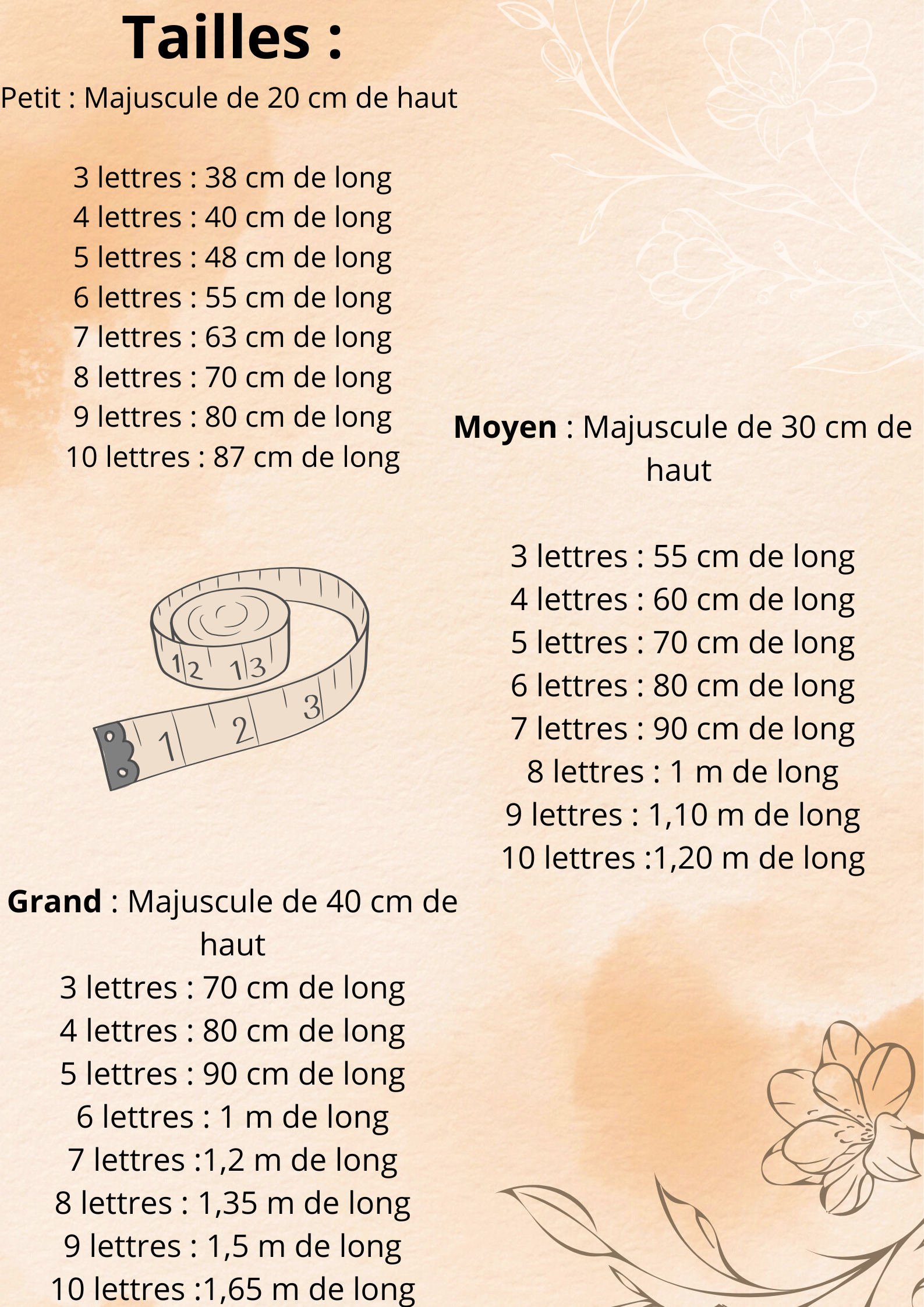 Les mots/ noms ou prénoms de grande taille font 38/4O cm de haut pour la majuscule : le reste s’adapte en fonction suivant le mot souhaité